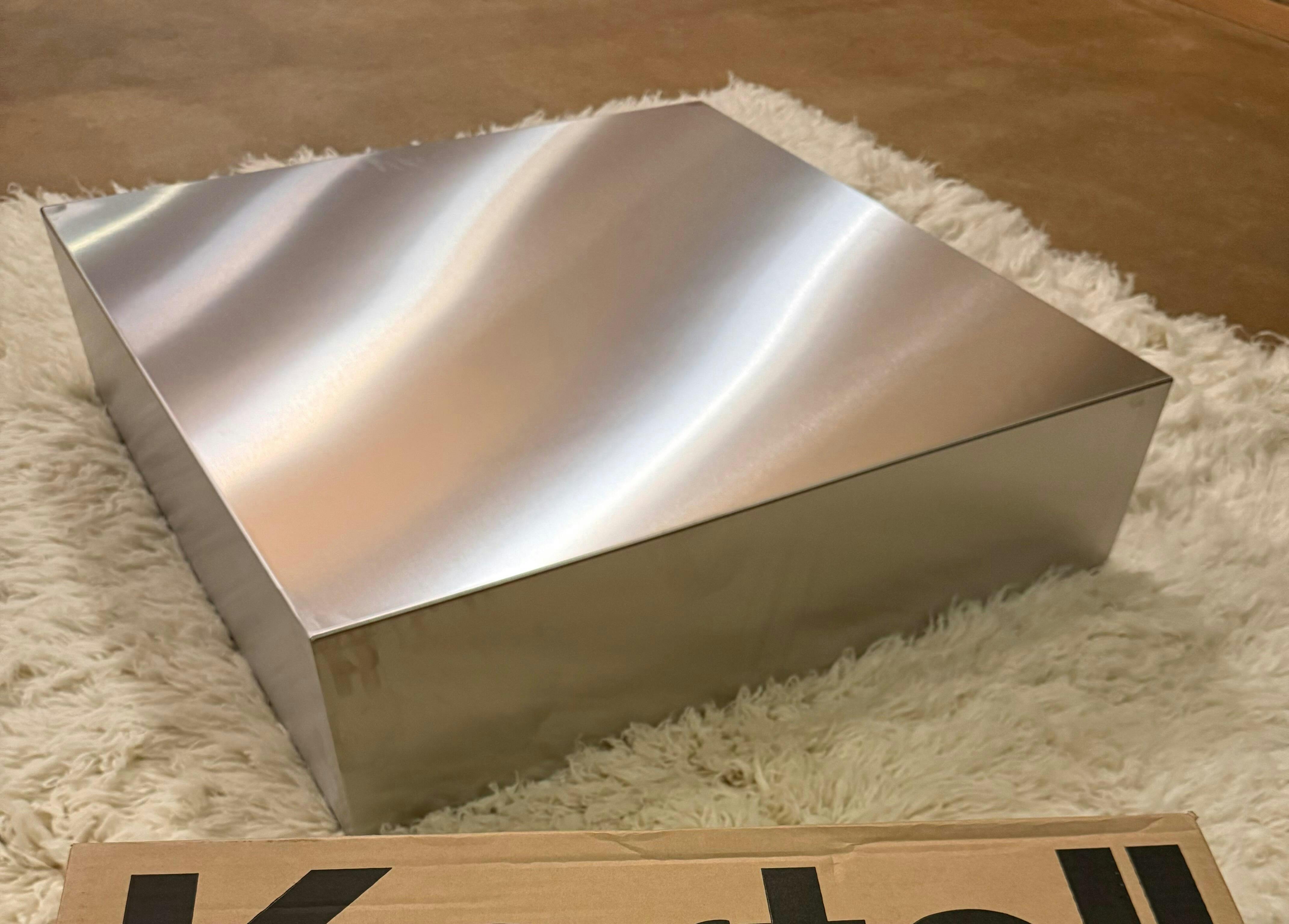 Puristische Silhouette, großzügige Fläche, gebürsteter Edelstahl (1,5 mm). Aus einem Stück präzise gekantet, innen hohl – zero Montage: auspacken, hinstellen, fertig. Die feine Bürstung reflektiert Licht weich und ist pflegeleicht. Kleinserie · Made in Germany.